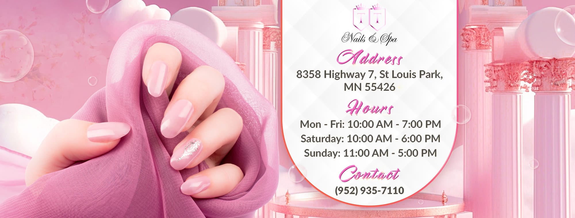Nail Salon Highway 7, St. Louis Park, MN 55426. Visit TT Nails & Spa for top-quality manicures and pedicures. Book your appointment today!